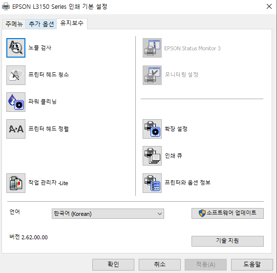 윈도우 설정에 [프린터 및 스캐너 - 프린터 선택 - 인쇄 기본 설정 - 유지보수]를 선택하면 위의 그림과 같은 창을 볼 수 있습니다.