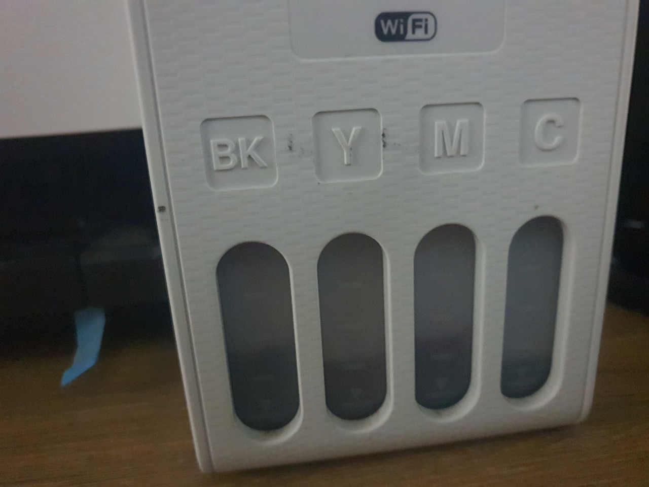 첫 번째로 잉크 확인입니다. 대부분의 프린터 잉크통은 투명색으로 되어 있어 해당 잉크가 얼마나 남았는지 육안으로도 확인할 수 있게 해 놓았습니다. 만약 잉크가 다 떨어졌다면 해당 색 인쇄 없이 나머지 색으로 인쇄할 것입니다. 어떤 프린터들은 하나의 잉크 색만 부족하더라도 인쇄 자체가 안 되는 경우도 있습니다.